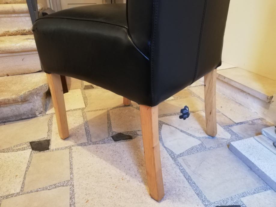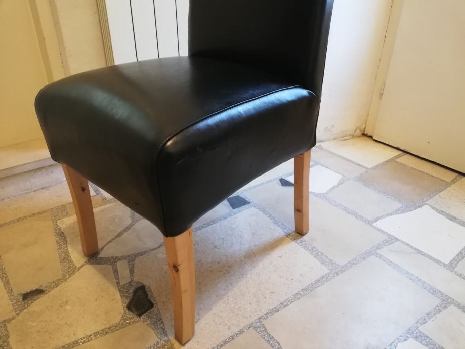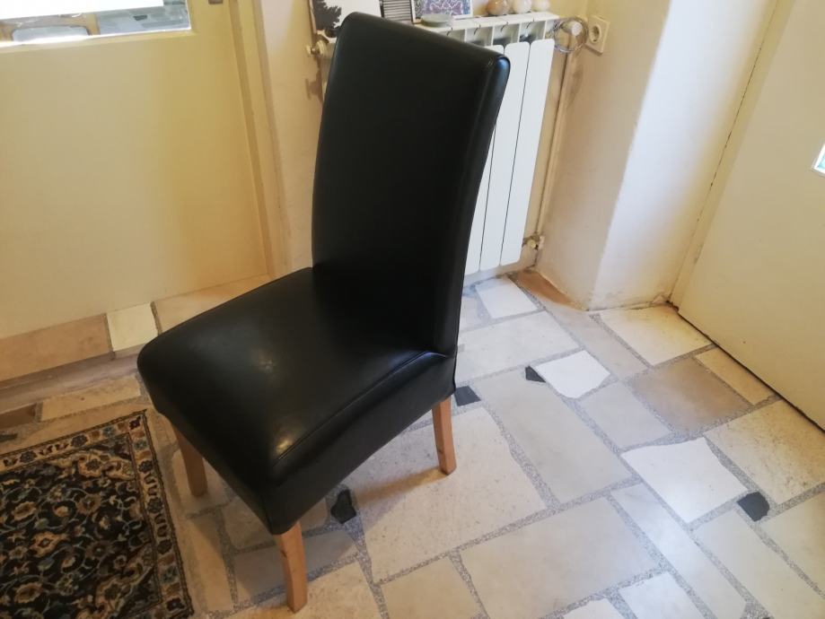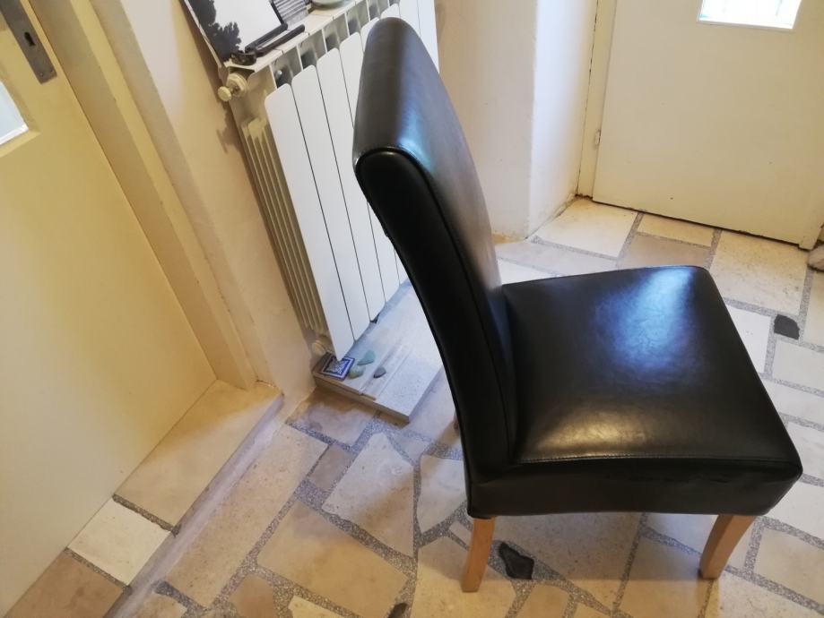 Črn usnjen stol, mehko sedišče in naslon, primeren za delovno ali jedilno mizo. Lepo izdelan lepi detajli. Lesene noge iz masivnega bukovega lesa. Malo rabljen. Prevzem v Kopru