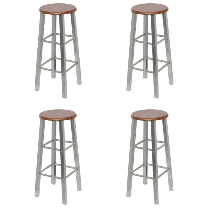 Ti 4 barski stolčki imajo klasičen, moderen dizajn ter so popolni za v vaš dom ali bar. Barski stolčki imajo vgrajene opore za noge na dveh različnih višinah, zato boste lahko na stolčkih udobno sedeli čez celoten večer. Sedež barskih stolčkov je izdelan iz rjavega materiala MDF (mediapan), okvir pa je izdelan iz jekla. Stolčki se lahko preprosto sestavijo in očistijo, ko je potrebno. Paket vsebuje 4 barske stolčke.