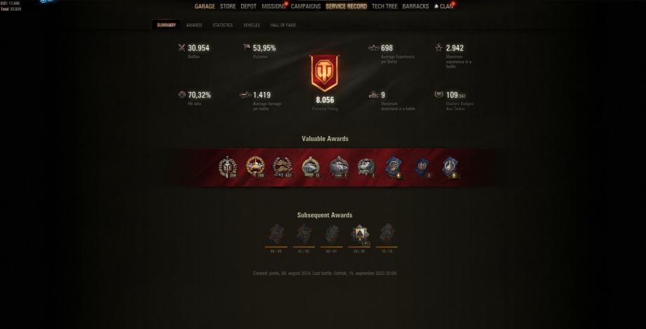 PRODAM WORLD OF TANKS RAČUN / WOT , na EU serverju, zaradi pomankanja časa, account je zelo kompetitiven z njim lahko greš v vse najboljše klane ter se poteguješ za najboljše tanke. Na računu je veliko različnih tankov, med boj zanimive spadajo: OBJ.279e, OBJ. 260, OBJ. 907, OBJ. 780, OBJ. 268 V5, WZ-111 QILIN in VK72.01K, ŠKODA T56, COBRA, KPZ 50t, CONCEPT 1B, 21 tier 8 premiuim tankov. Poleg tega je na računu je še 43 tier 10 tankov . Na računu je tudi 4,1k golda, nekaj silverja (10m), 71k bondov, ter nekaj 100k xp-ja. Poleg velikega števila različnih tankov, pa je na računu tudi veliko število posadk z več kot štirimi skilli. Iz slik so razvidni še preostali tech-tree tanki. Ogromno boosterjov, equipmenta, 3D stylov, POSADKE ZA VSE META TANKE Z MINIMALNO 4MI SKILLI NA OSEBO....