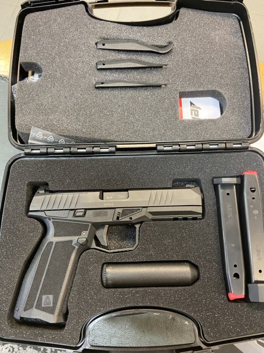 Prodamo NOVO pištolo Arex Delta L gen.2 Optic ready v kalibru 9x19. Druga generacija slovenske pištole Arex Delta z možnostjo namestitve rdeče pike - OR - Optic Ready. Dolžina cevi je 4.5" (114 mm), višina 140 mm, zadnji merek je nastavljiv po smeri, proženje je SA z notranjo udarno iglo, na sprožilcu je varovalka. Pištola ima razširjeno odprtino ročaja za hitrejše in lažje vstavljanje nabojnikov, indikator napete udarne igle, dodatne nastavke za prilagajanje debeline ročaja, 5 ploščic za namestitev rdeče pike z različnimi podnožji in 1 nabojnik kapacitete 19 nabojev ter 1 nabojnik kapacitete 17 nabojev. Teža pištole je 650 g.
