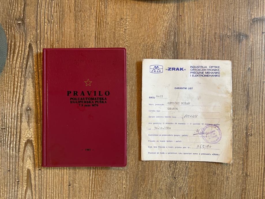 Prodam skoraj nerabljeno (cca 20 strelov) PAP Zastava M76, letnik 1980. Vse na puški je original in v vrhunski kondiciji. Številke so vse ujemajoče, vključno z bajonetom. Dodajam ves pribor (torbica s 4 nabojniki, čistilni pribor, pokrivalo optike, jermen, bajonet, pravilo M76 in garancijski list optike z ujemajočimi se številkami). Puška in vse kar je v kompletu je praktično nedotaknjeno. Prodam samo imetniku ustreznega nabavnega dovoljenja.