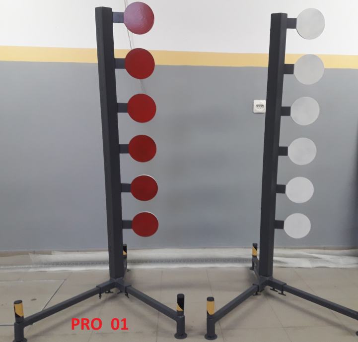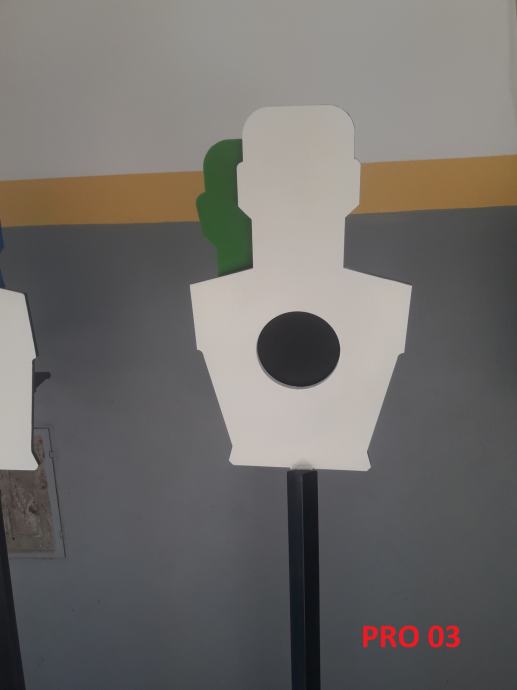 PRO 03 - Silhueta s kovinskim podstavkom (razstavljiv za transport). Center silhuete črne barve se ob zadetku odpre in nato ponovno samodejno zapre - streljanje nadaljujemo. Glava zadaj (zelena-modra) se zarotira za 180°. Center silhuete lahko nastavimo, da ob zadetku ostane odprt (za tekmovanje).