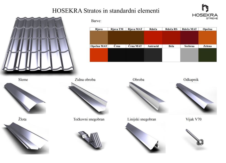 Stratos je popolna izbira, če želite združiti trdnost z eleganco in tradicionalnim keramičnim strešnim izgledom. Streha je narejena iz jekla, visoke kakovosti. Z primerjavo z drugimi strešnimi kritinami ima tudi prednost v zelo nizki teži, 5 kg/m2, kar nam zelo olajša delo pri nameščanju kritine.