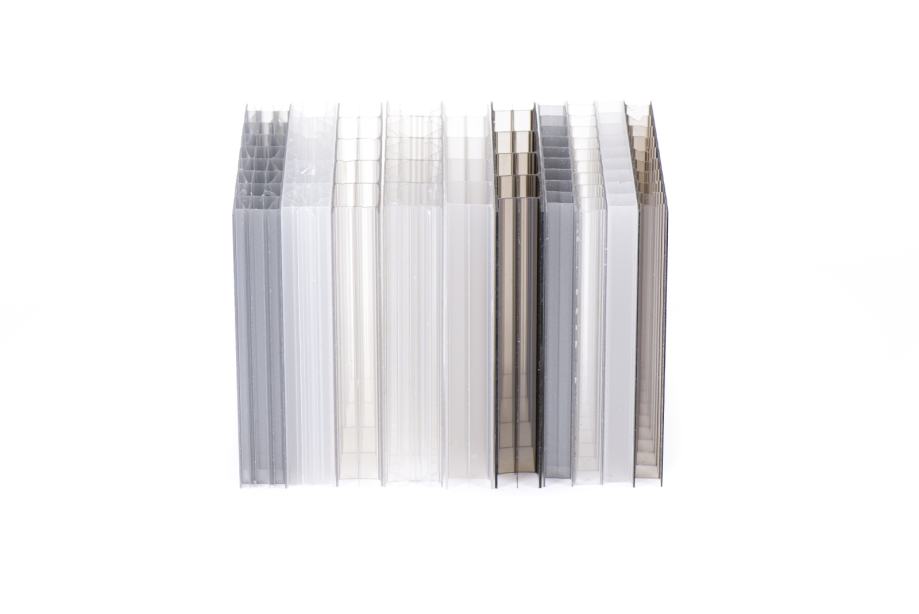 Večslojne polikarbonatne plošče so na voljo v debelini 4 do 32 mm v prozorni, mlečno beli, dimljeno rjavi in sivi barvi. Na voljo so v širini 1200 in 2100 mm dolžine vse do 9000 mm.