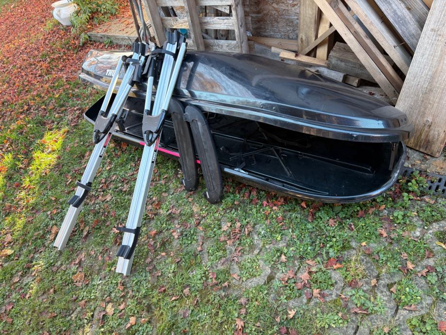 Thule strešni kovček, dim. 230x65x35cm, volumen cca. 400l, star cca. 20let, zelo lepo ohranjen. Odpiranje ima dvostransko. Poleg kovčka prodajamo še 2x nosilec za smuči, ter 2x nosilec za kolesa. Vsi elementi imajo ključavnico. Cena je za komplet. Dodamo še dve nosilni palici brez ključavnic.