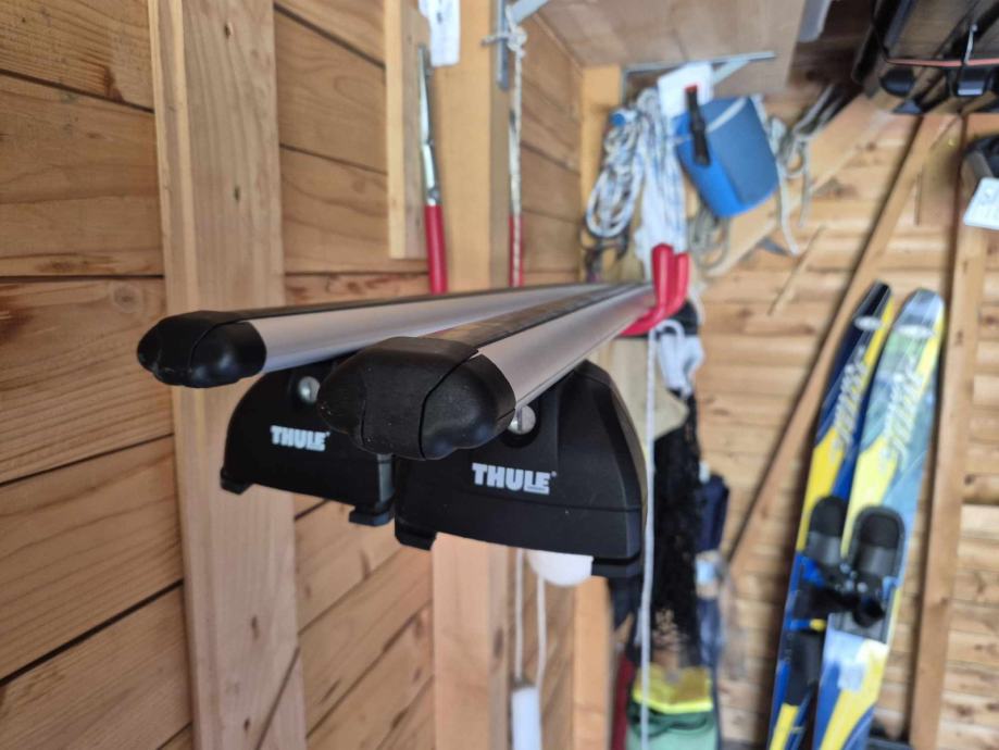 Prodam komplet originalnih Thule strešnih nosilcev z nogicami, z vzdignjenimi strešnimi sanmi (t.i. odprti railing).