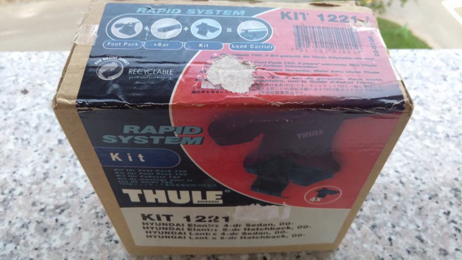 Zaradi neuporabe prodam Thule Kit 1221. Kit je primeren za starejša vozila Hyundai Elantra in Lantra.