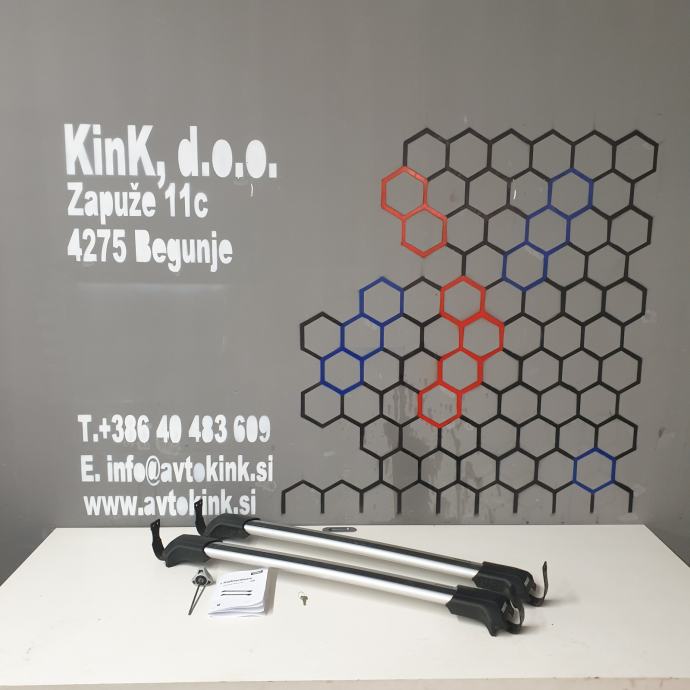 V kompletu so Wingbar Evo prečke v srebrni barvi, nosilne noge Thule 7204, navodila za montažo in uporabo, orodje in ključ.