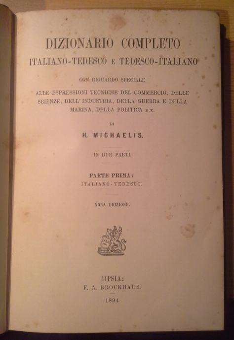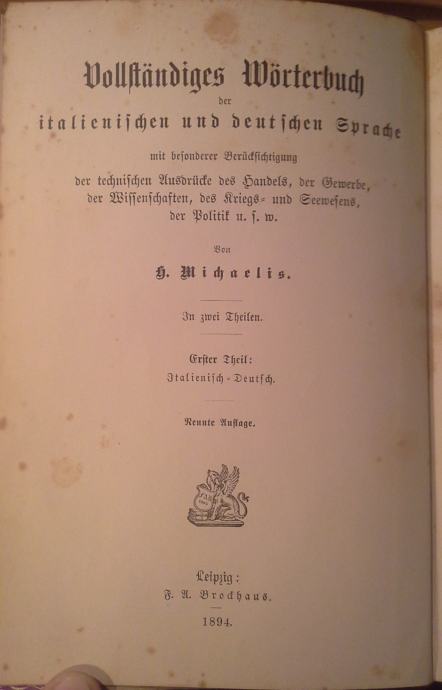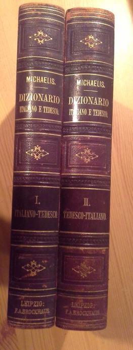 H. Michaelis, Vollständiges Wörterbuch der italienischen und deutschen Sprache, Leipzig : Verlag: F. A. Brockhaus, 1894-1895, 2. Bd. (640, 719 str.)