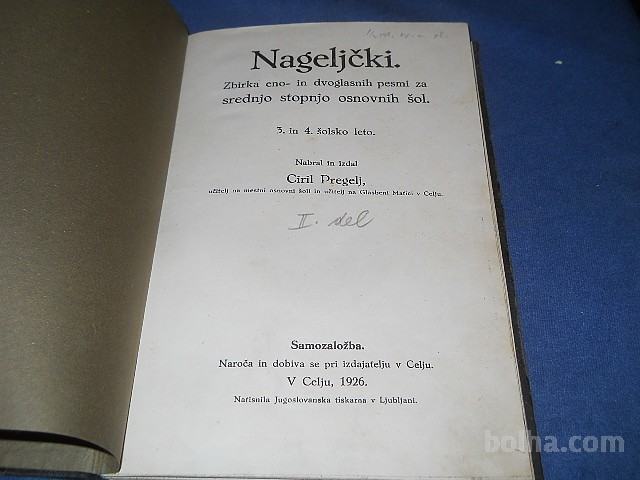 Nageljčki-zbirka eno in dvoglasnih pesmi za srednjo stopnjo osnovnih šol 3 in 4 šolsko leto,nabral in izdal Ciril pregelj,Samozaložba v Celju 1926 letnik,ima 49 strani,pošljem po pošti ali osebni prevzem.