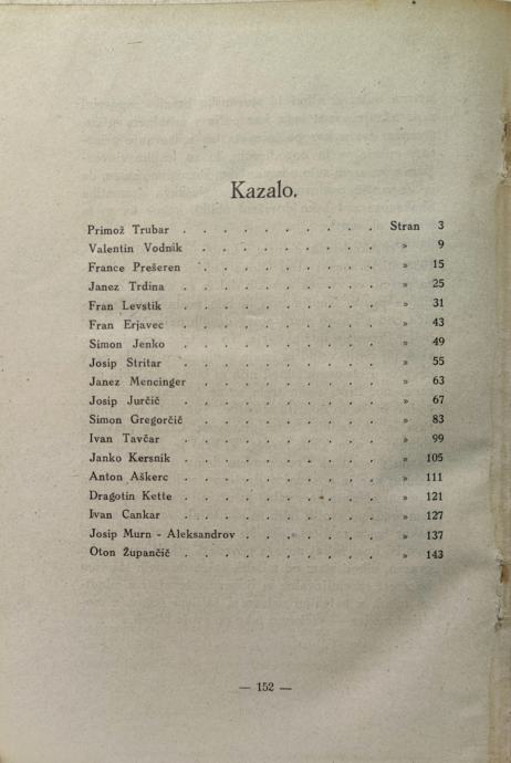 Platnica Lojze Spacal, obravnava: Primož Trubar, Valentin Vodnik, France Prešeren, Janez Trdina, Fran Levstik, Fran Erjavec, Simon Jenko, Josip Stritar, Janez Mencinger, Josip Jurčič, Simon Gregorčič, Ivan Tavčar, Janko Kersnik, Anton Aškerc, Ivan Cankar, Dragotin Kette, Josip Murn Aleksandrov, Oton Župančič