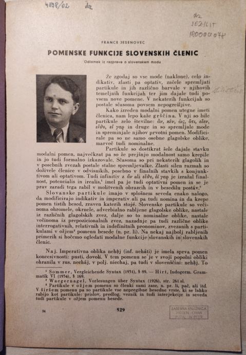 Pomenske funkcije slovenskih členic / France Jesenovec, 1944, jezikosl