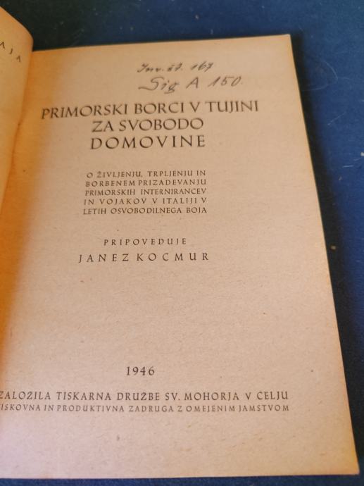 Primorski borci v tujini za svobodo domovine(o življenju ,trpljenju in borbenem prizadevanju primorskih internirancev in vojakov v Italiji v letih osvobodilnega boja),pripoveduje Janez Kocmur,letnik 1946 založila tiskarna družbe sv.Mohorja v Celju ,knjiga ima 79 strani,pošljem po pošti ali osebni prevzem.knjiga je v zaboju pod zaporedno številko 24 .