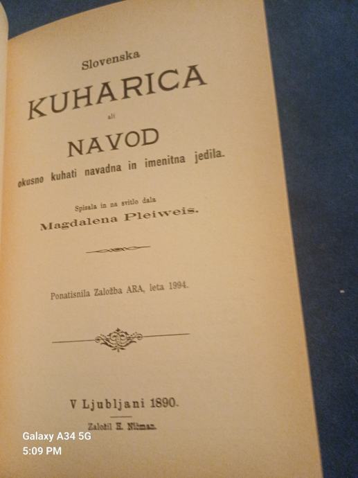 Slovenska kuharica ali navod(okusno kuhati navadna in imenitna jedila),spisala Magdalena Pleiweis,ponatisnila zalozba ara leta 1994,Ljubljana 1890,knjiga ima 320 strani,posljem po posti ali osebni prevzem.knjiga je v zaboju pod zaporedno stevilko 100.