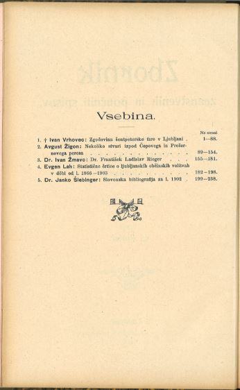 Vsebina Vsebina: Zgodovina šentpeterske fare v Ljubljani / Ivan Vrhovec. Nekoliko stvari izpod Čopovega in Prešernovega peresa / Avgust Žigon. Dr. František Ladislav Rieger / Ivan Žmavc. Statistične črtice o ljubljanskih občinskih volitvah v dôbi od l. 1866-1903 / Evgen Lah. Slovenska bibliografija za l. 1902 / Janko Šlebinger