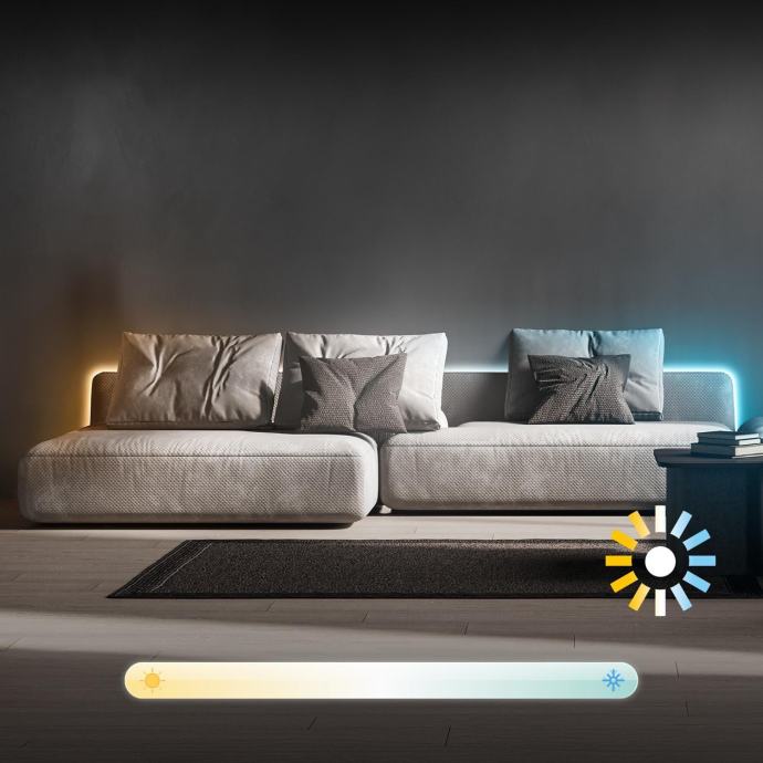 Ta fleksibilni RGBIC LED-svetlobni trak s 5 metri dolžine, RGBIC barvnimi načini in nastavljivimi belimi toni (od 2.700 do 6.500 K) ponuja vsestranske možnosti za kreativne svetlobne rešitve in ustvarjanje ambientalnih poudarkov v notranjih prostorih.Prilagodljiva barva svetlobeS 150 LED-diodami in močjo 24 W (1.200 lm) lahko brezstopenjsko nastavite barvo svetlobe - od toplo bele do dnevno bele. To je idealno za vsako razpoloženje in uporabo, od zabav do dekorativnega oblikovanja prostora.Brezstopenjsko zatemnjevanjeSvetlost lahko udobno prilagodite z daljinskim upravljalnikom. Vgrajena pomnilniška funkcija shrani zadnje izbrane nastavitve, kar je popolno za prilagodljivo osvetlitev za zabave.Praktične lastnostiSamolepilni trak lahko skrajšate vsakih 20 cm in ga individualno prilagodite. Napajalni kabel in 24 W gonilnik sta vključena v dobavo, kar omogoča takojšnjo uporabo.Stopnje zaščiteTrak je odporen na škropljenje (IP44), medtem ko je gonilnik primeren za suhe notranje prostore (IP20). Zaradi tega je svetlobni trak idealen za dekorativno uporabo v bivalnih prostorih, igralnih sobah ali na zabavah.