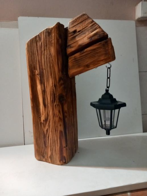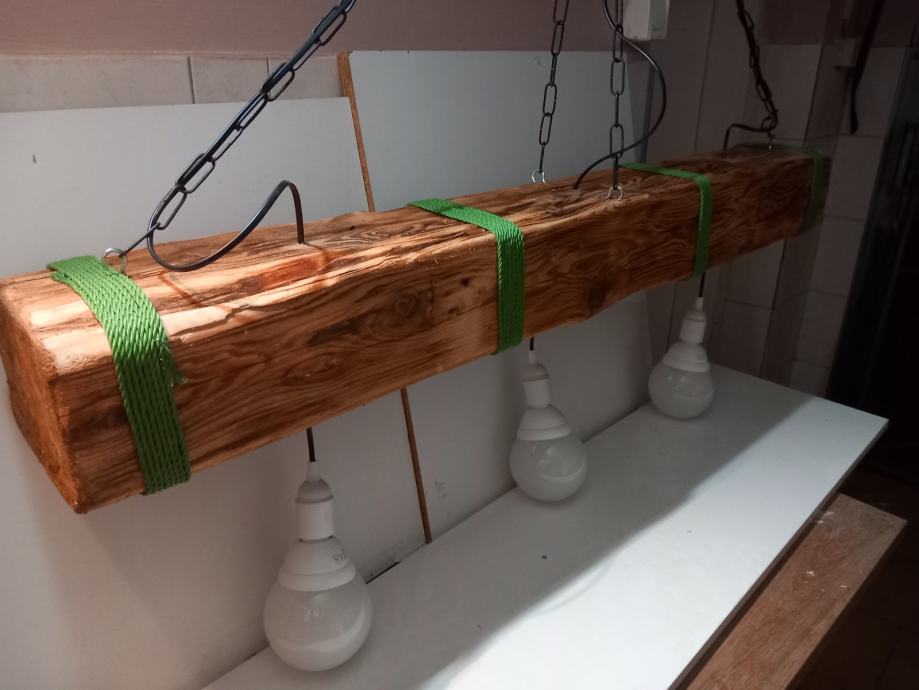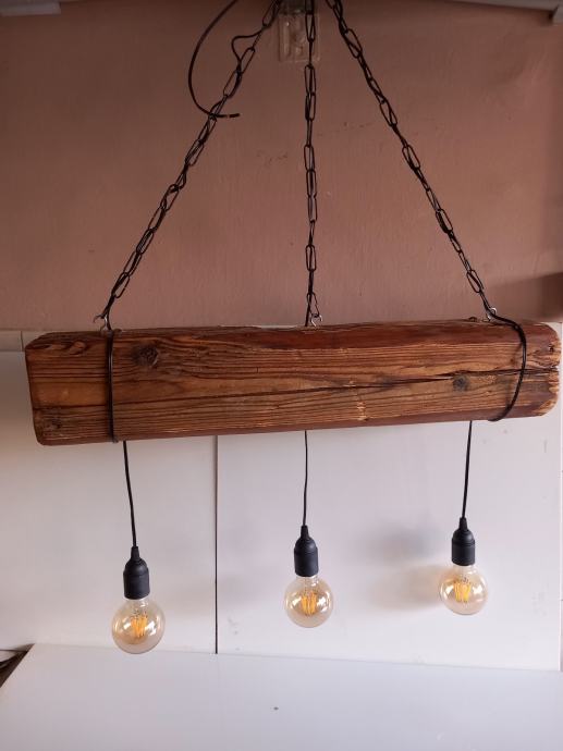 Prodajam novo rustikalno stropno svetilo z lesenim nosilcem in visečimi lučmi v zaščitnih mrežicah. Svetilo je ročno izdelano z detajli iz vrvi in ustvarja prijetno, toplo ambientalno razsvetljavo. Popolno za domače ambiente, kjer želite dodati rustikalen in edinstven značaj vašemu prostoru.