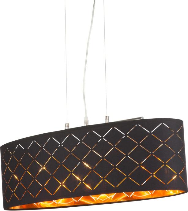Z izjemno moderno visečo svetilko Clarke črne barve ustvarite svetlobne poudarke. Vsestransko uporaben model z okrasno perforacijo in zlato notranjo barvo ovalnega tekstilnega senčnika pripomore k udobnemu okolju. Ta svetilka je opremljena z okovom E27, ki omogoča poljubno izbiro žarnice. Zaradi prihranka energije in dolge življenjske dobe priporočamo LED-sijalke.