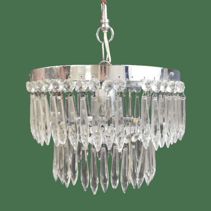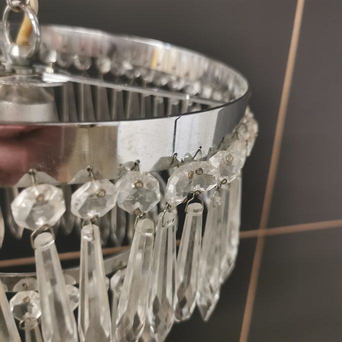 Elegantni stropni lestenec s kovinsko konstrukcijo in visečimi kristali. Ponuja prefinjen videz in poskrbi za prijetno osvetlitev prostora. Primeren za dnevne sobe, jedilnice ali druge notranje prostore.