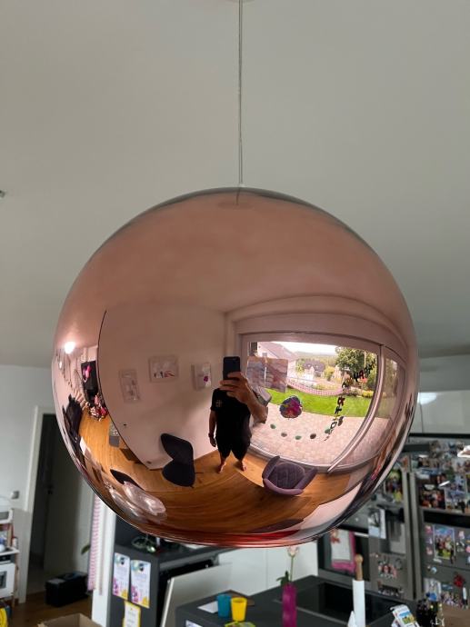 Prodam 2 luci za jedilnico barve rose gold. Luci sta rabljeni, na obeh je nekaj manjsih risov. Gre za kopijo luci Toma Dixona. Dimenzija ca 45cm. Cena za obe 40€.
