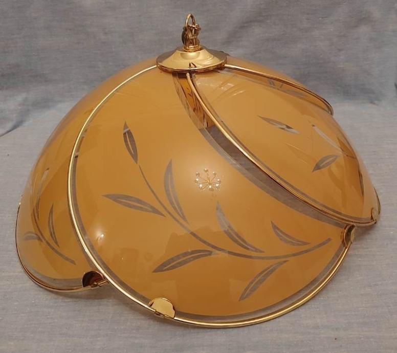 LEPA STROPNA LUČ, OHRANJENA, KOMBINACIJA KOVINE IN STEKLA V ZLATI BARVI, Z MOTIVOM LISTNATIH VEJIC.
