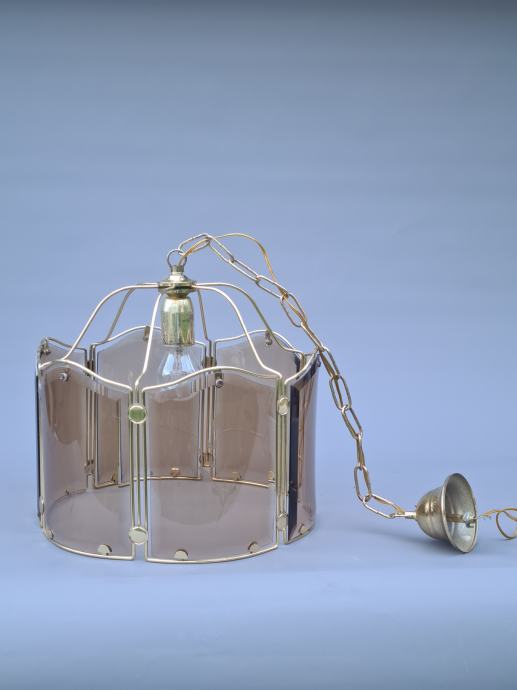 Luster z rjavim steklom in pozlačenim ogrodjem, premer meri 45 cm ter višina 95 cm. Na steklu so tudi dekorativni listi.