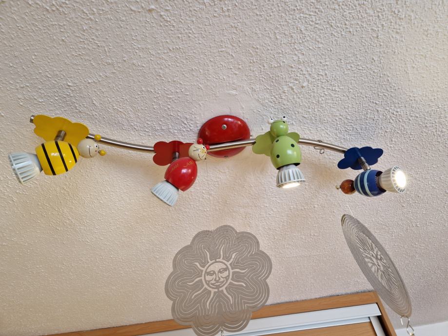 Prodam odlično ohranjeno otroško stropno ali stensko svetilko EGLO TAYA s štirimi LED reflektorji z otroškimi živalicami ( medvedek, žabica, čebelica in mucka). Dolžina 70cm.