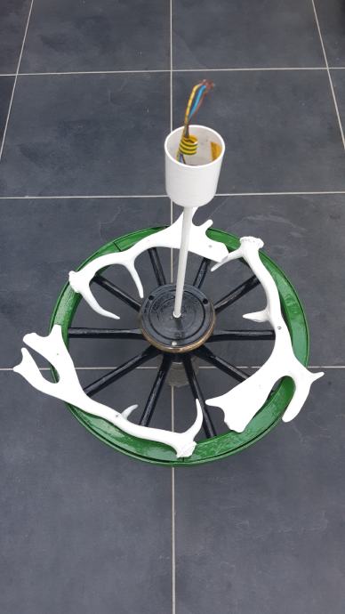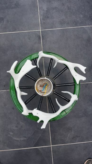 Prodam obnovljen lovski stropni lestenec,izdelan iz kolesa voza in rogovja,z dodano lučjo.Primeren je za lovske sobe ali lovske vikende.Premer znaša 55 cm,višina 70 cm.Pošljem po ceniku Pošte Slovenije.