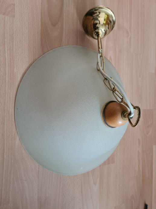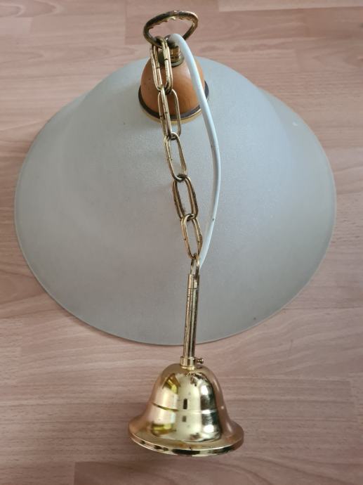Prodam steklen lestenec premera 37cm. Višina steklenega zvona je 12cm, višina z lesenim delom je 20cm, skupna višina pa je 47 cm. To višino je možno z dodajanjem ali odvzemanjem členov verige spreminjati. Lestenec ima žarnično grlo za običajne E27 sijalke.