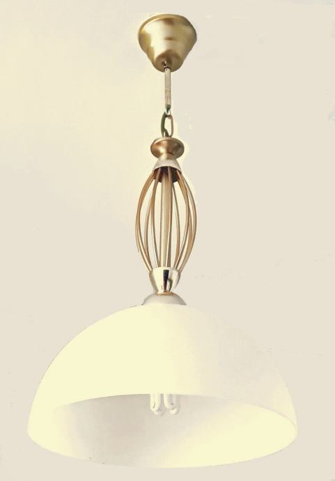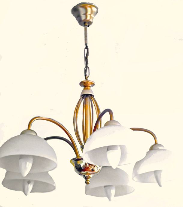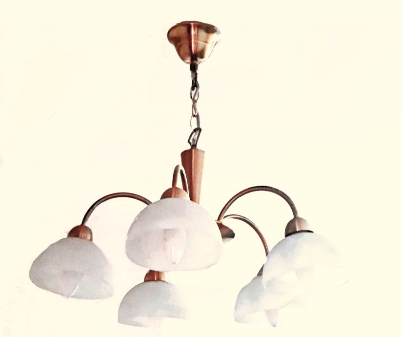 1- stropna svetilka z petimi ločenimi lučmi, obodi matirano steklo, zvončaste oblike, razvejan cevni nosilec iz kovine v barvi medenine, navoji za žarnice E14, delno višinsko nastavljiva.