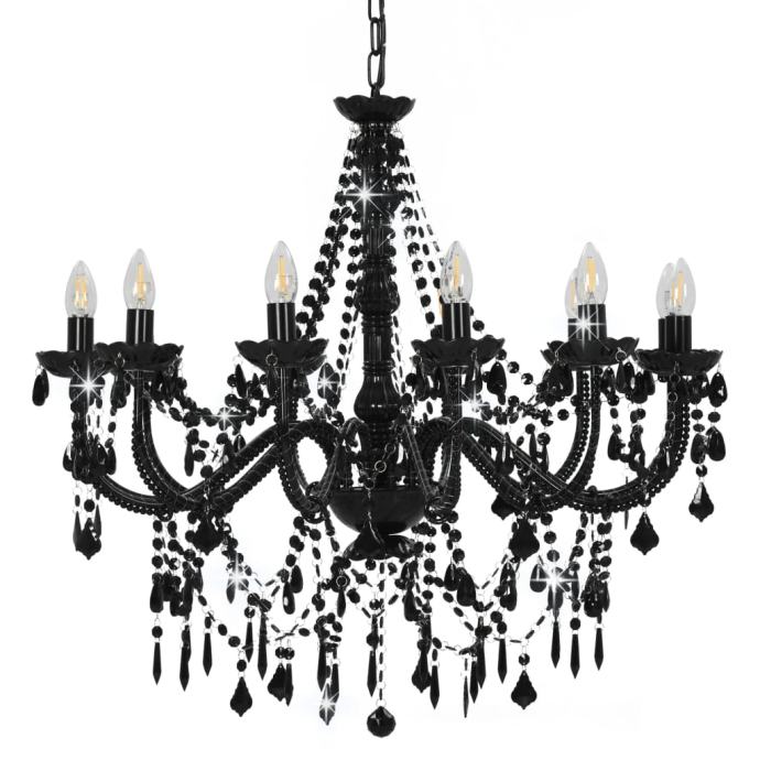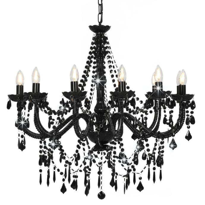 Ta odlično oblikovan lestenec s črnimi kroglicami bo zagotovo naredil velik vizualni vtis in bo prava zvezda vašega hišnega dekorja. Lestenec je primeren tako za domačo, kot za komercialno rabo. Navojna grla v obliki sveč in čiste kapljice prispevajo k pridihu starinskega čara ter ustvarjajo čudovito osvetlitev. Lahko izberete in namestite žarnice E14 v različnih barvah ter tako ustvarite sproščeno in spokojno vzdušje. Prosimo, upoštevajte, da izdelek ne vsebuje žarnic. S pomočjo materialov za montažo lahko visečo svetilko enostavno in varno sestavite in namestite.