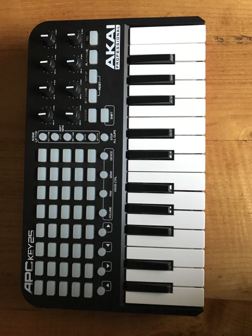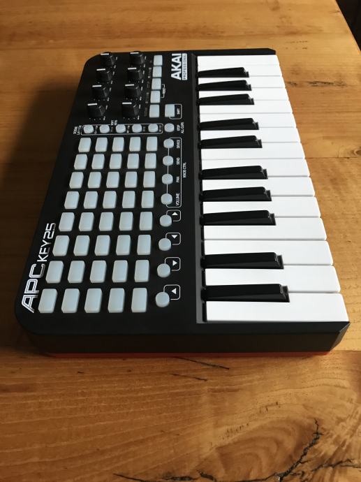 Mini kontroler klaviatura, 25 dinamičnih tipk, 40 led clip gumbov, gumbi za navigacijo glasbenih programov in 8 vrtljivih potenciometrov.