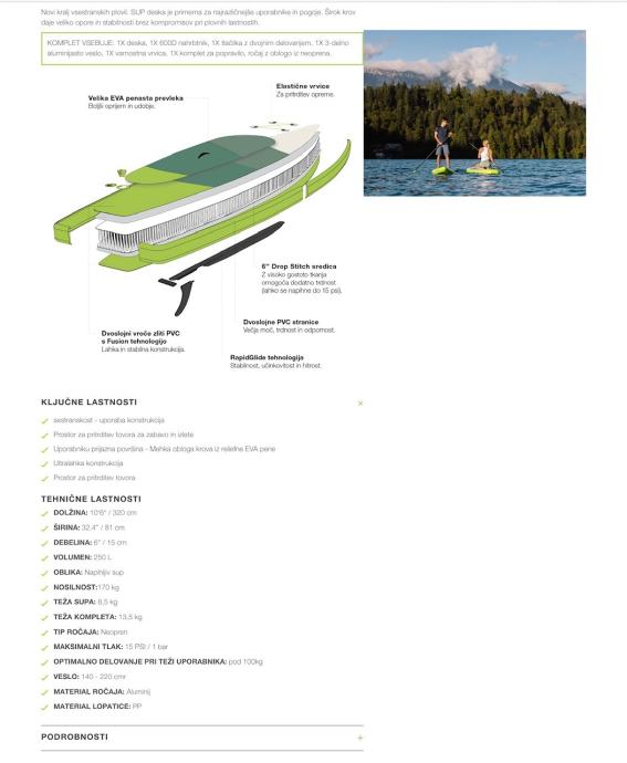 Komplet poleg napihljivega SUP-a sestavljajo še tlačilka, veslo, vrvica, ročaj z oblogo iz neoprena, komplet za popravilo in nahrbtnik