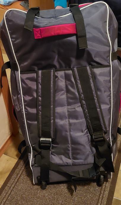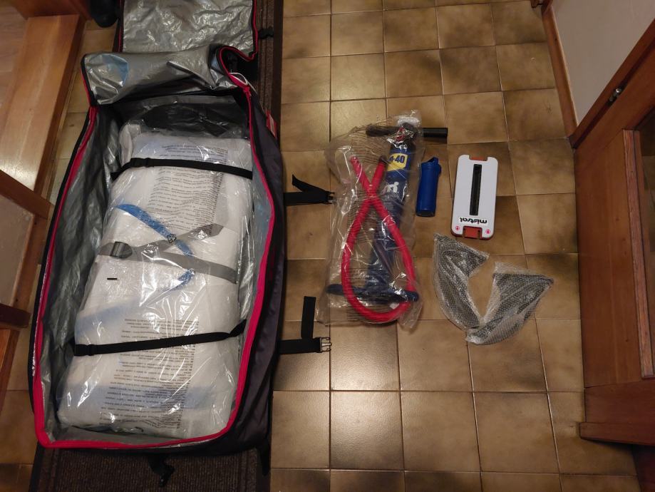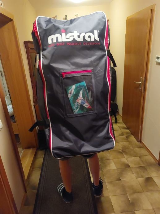 Je v super kakovostni torbi na kolesih in z naramnici v kateri je zložen sup, pumpa, komplet za popravilo ter predpriprava za jadro.
