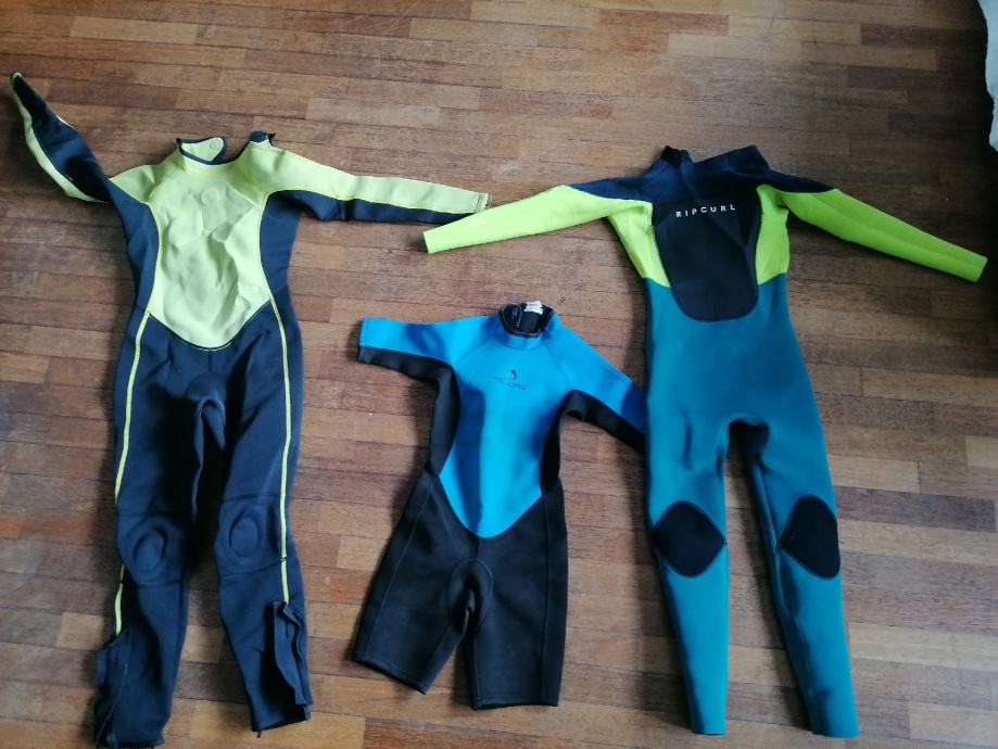Prodam tri neoprene različne velikosti s kratkimi rokavi 10 let 10 €, rip curl velikosti 12 let 2/3 mm debelina 50 €. Tribord 11 let debelina 2 mm 10 €