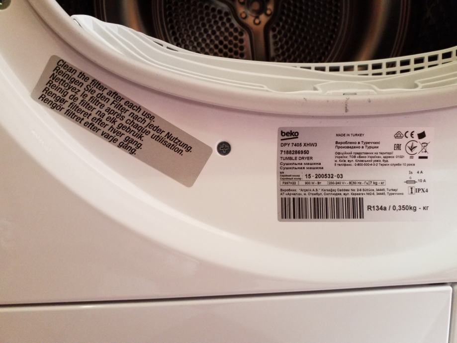 Beko DPY 7405 XHW3. Postavitev aparata: Prostostoječi, Vrsta nalaganja: Nalaganje spredaj, Sistem sušenja: Toplotna črpalka. Prostornina bobna: 7 kg, Razred sušenja: A, Čas cikla: 156 min. Delay start (max): 24 h, Nastavitev noge: 2 cm. Razred energijske učinkovitosti: A++, Letna poraba energije: 207 kWh, Vir toplote: Električna energija. Širina: 595 mm, Globina: 609 mm, Višina: 866 mm