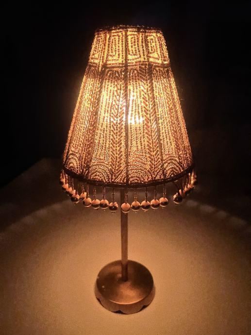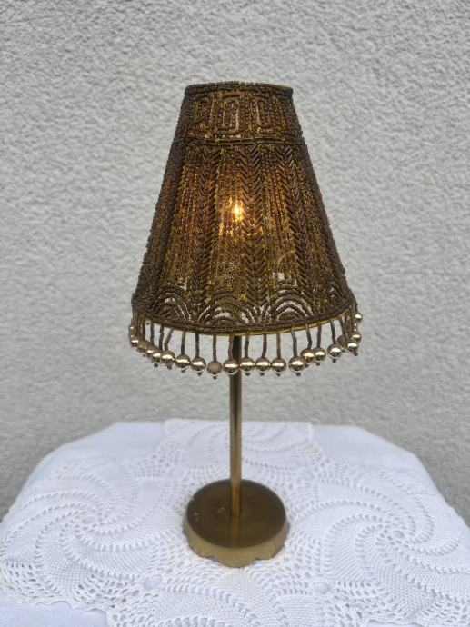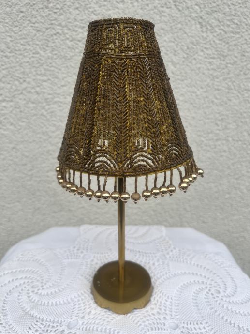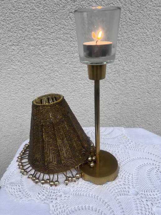 Prodam zelo lep dekorativen svečnik iz kovine v zlati barvi. Ima bogato okrašen senčnik z drobnimi perlicami, ki ustvarjajo topel in eleganten videz. Čajno svečko vstavimo v stekleni del.