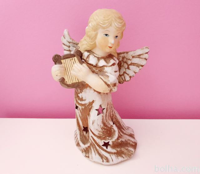 Prodam keramični svečnik, v podobi angelčka, ki igra na harfo. Svečnik je visok 22cm in je primeren za uporabo čajnih svečk.