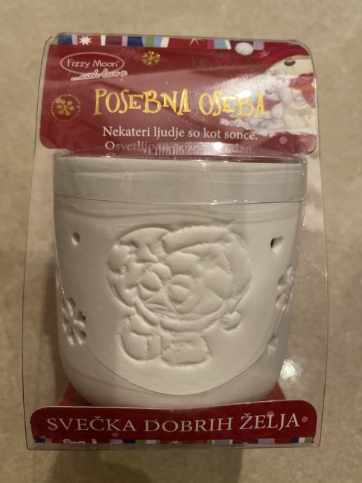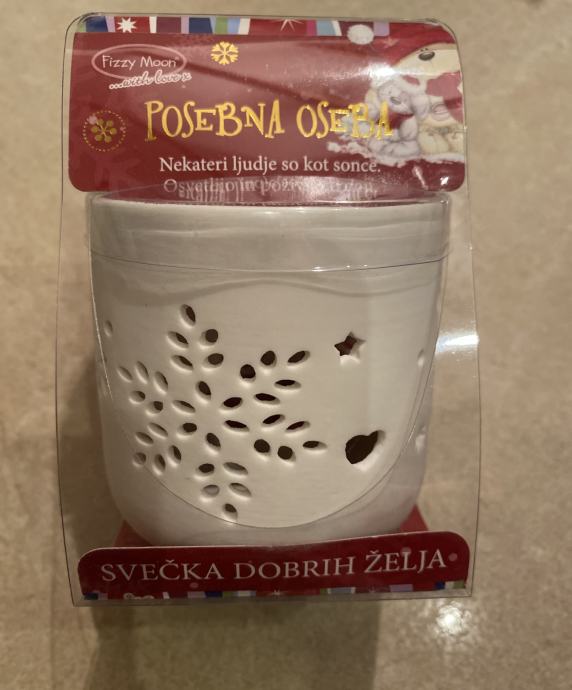 Prodam NOV čudovit komplet Fizzy Moon with Love: SVEČNIK iz kvalitetne bele keramike, z izrezanimi malimi zvezdicami, srčki in snežinkami, skozi katere pronica svetloba, ter s priloženo rdečo SVEČKO, v rdečem darilnem kompletu, z lično embalažo njihovih prikupnih medvedkov in napisom: "SVEČKA DOBRIH ŽELJA", na kateri je na vrhu v zlati barvi zapisano: "POSEBNA OSEBA" in pod tem tudi čudovita topla misel: "Nekateri ljudje so kot sonce. Osvetlijo in poživijo ti dan." :))