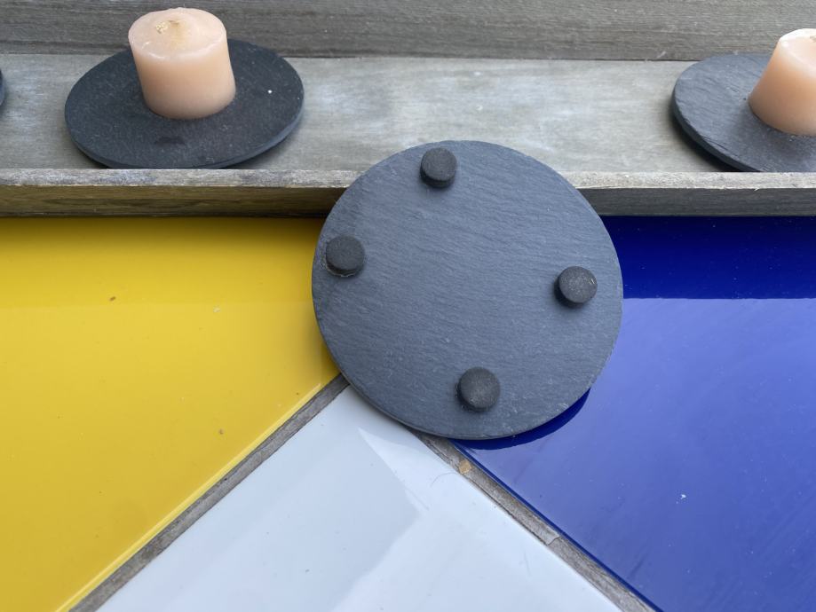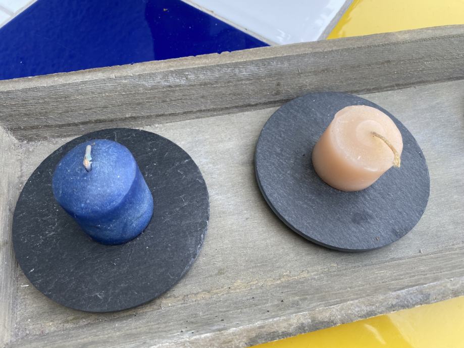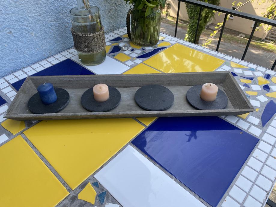 Staro toda lepo izdelano in cisto leseno taso s svecami na kamenitih podstavkih, primerno za dekor spalnic, sob in kopalnic
