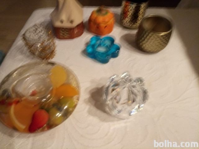 Za čajne svečke. Cena vsakega je 3 eur razen večjega z sadjem in kristalnega iz Rogaške in kovanega za katere je cena 10 eur za vsakega, za svečnik za oljno svečko je cena 5 eur.
