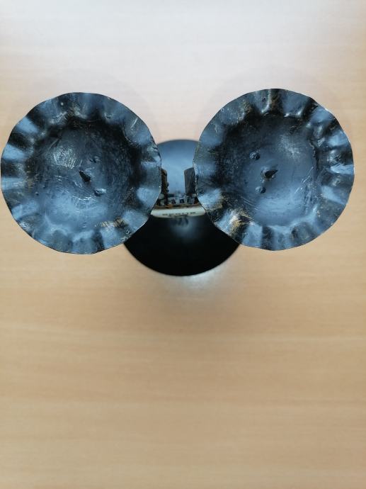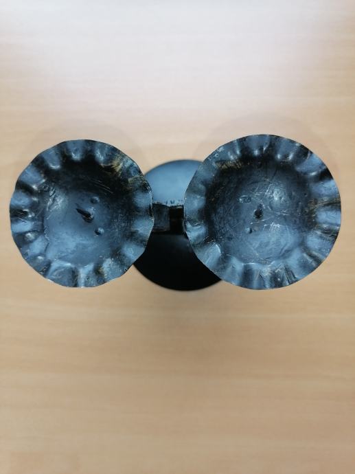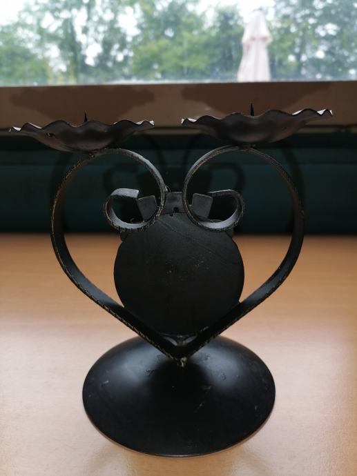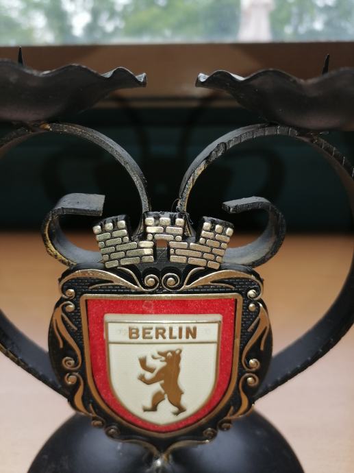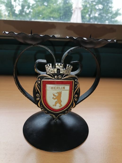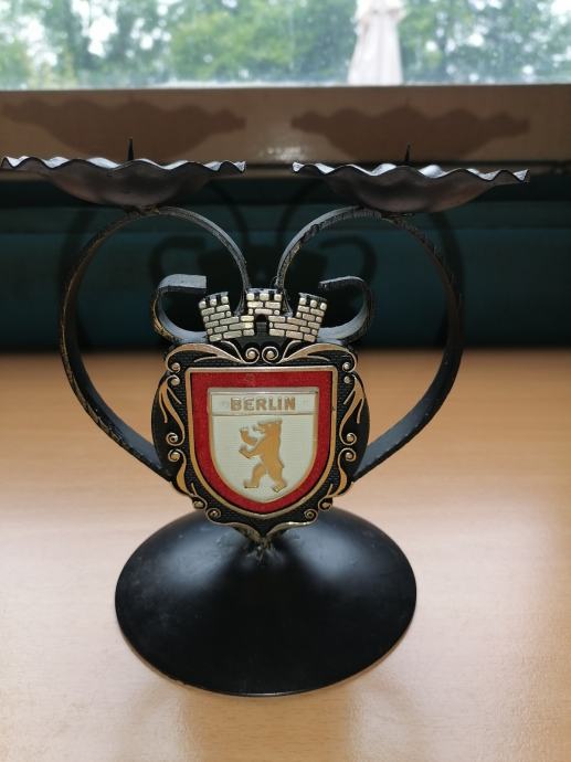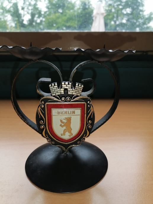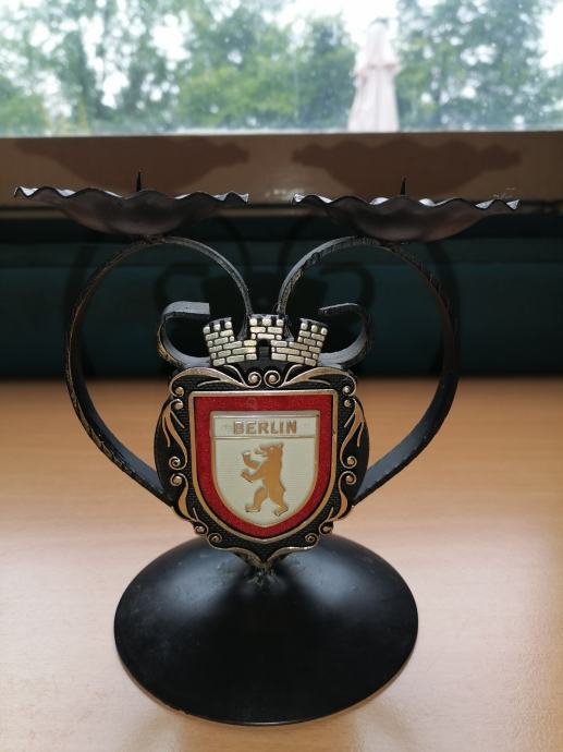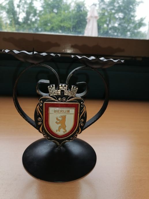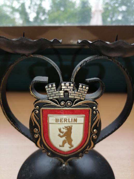 Še iz časa,ko je bila valuta še nemška marka.Za dve srednje debele sveče.Črne barve.V obliki srca in,z okroglim stojalom.Na sredini srca,je,iz močne masivne kovine oblikovan kockasti simbol BERLINA,v baročnem vzorcu,v zlati barvi,v sredini simbola,ki je obrobljen v zlati barvi,je nekaj rdečega pliša in masivno izbočen in v zlati barvi napis BERLIN in žival,na smetanovi beli barvi.Lepo ohranjen.Njegove mere: premer svečnikov 6,8cm,premer stojala spodaj 10,5cm,višina 13,8cm. Tel.064 222 880,pošljem po navadni pošti ali osebni prevzem.