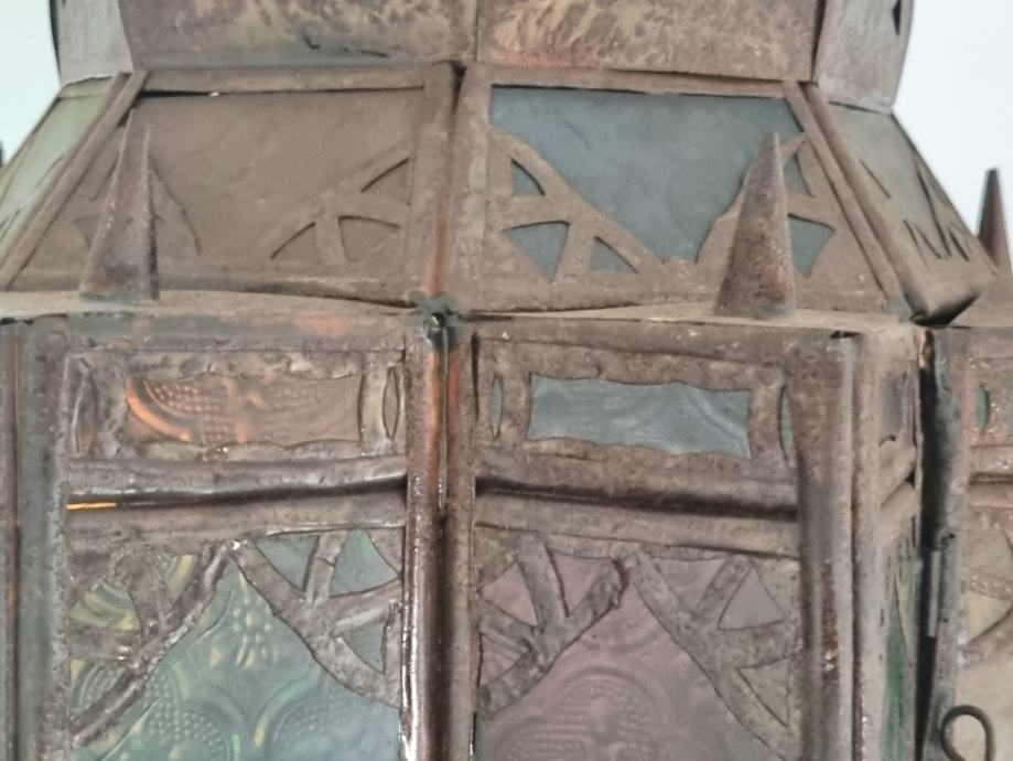Obrtniško umetelno izdelana stropna večna luč za NER TAMID najverjetneje na oljčno olje ali za svečo, ki je stala v židovskih molilnicah pred ali nad skrinjo zaveze (tora, talmud...) po celem Balkanu in tudi bližnjem vzhodu in opozarjala na stalno božjo navzočnost. Izvor tele je Varaždin, podobno najdemo v sinagogi v Sarajevu in verjetno še kje. Izdelana sredi 19. stoletja, barvna stekla z vzorci (rumena, zelena, modra), patinirana pločevina, brez poškodb, kompletna, muzejski primerek, ljubiteljska cena