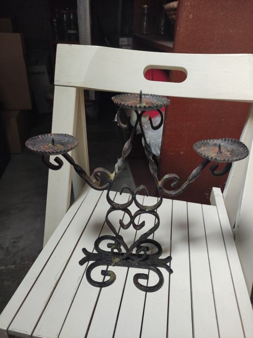 Prodam star kovinski svečnik črne barve, za 3 sveče, višine cca 30cm.