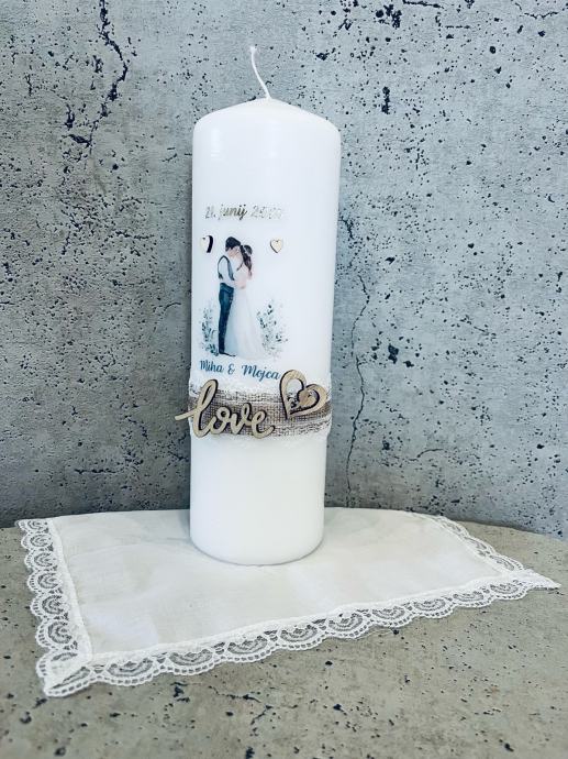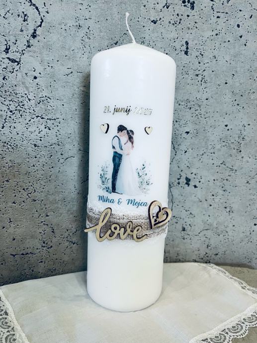 Personalizirana poročna sveča v poljubnem stilu. Po dogovoru tudi vabila, zahvale, konfeti itd.