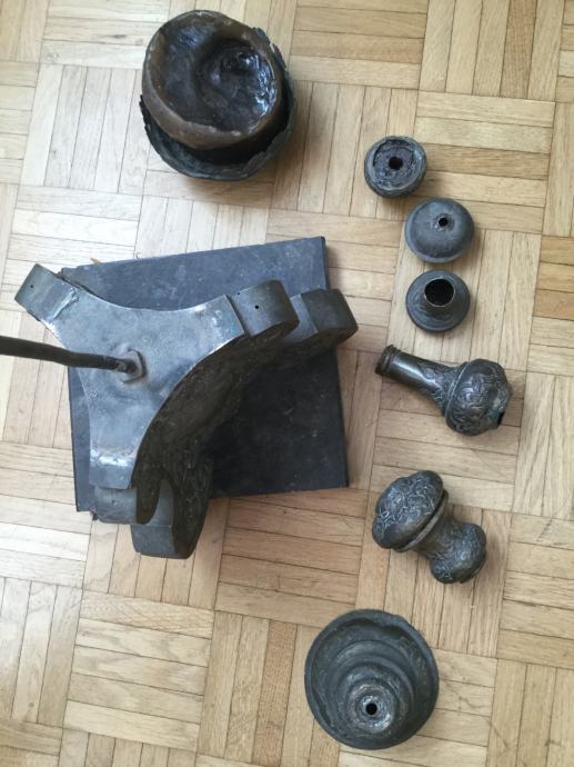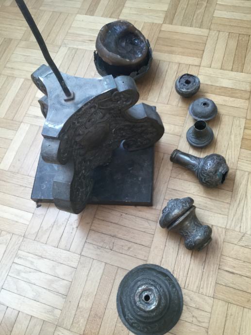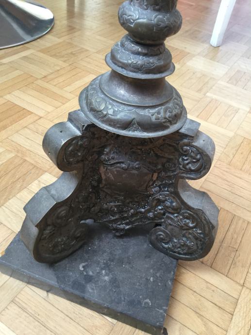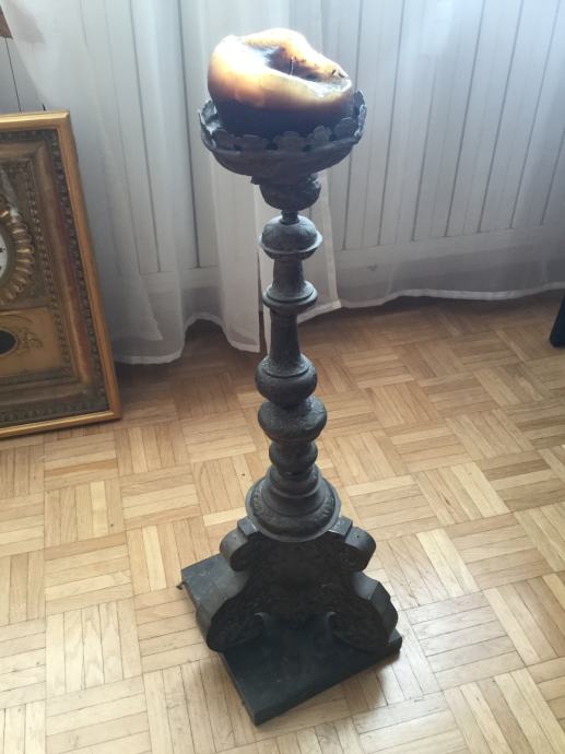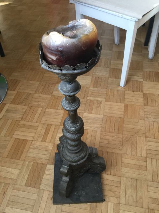 Star svečnik, prostostoječ, talni, sestavljen iz kovinskih elementov, kot je razvidno iz slik. Stoji na kamniti plošči. Ni v dobrem stanju, primeren bolj za dekoracijo ali za restavriranje. Visok je cca 65 cm.