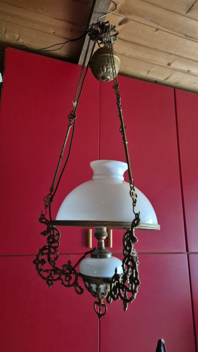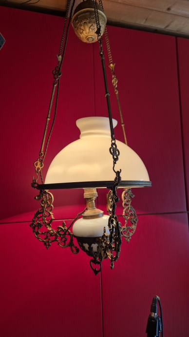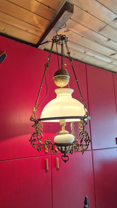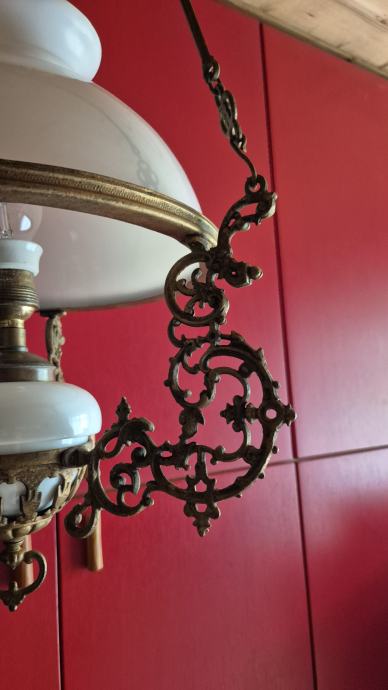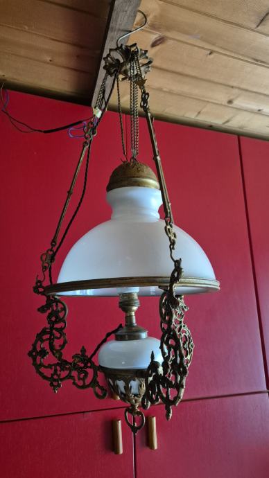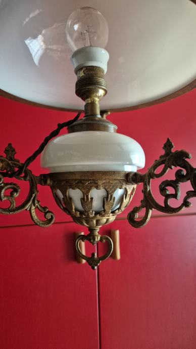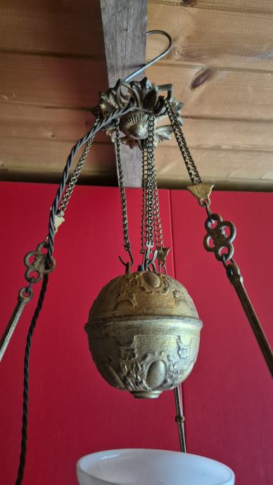 Stropna električna luč- secesija, prilagodljiva višina od 70- 80 cm, steklo opal, stara 100-110 let, delujoča, lepo ohranjena. Cena 285 eur, info 040 225 001