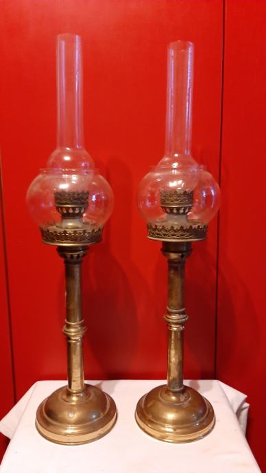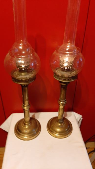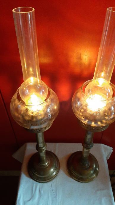 Visoka svečnika iz medenine in stekla na svečo z dvojno zasteklitvijo. Vzmeti za svečo delujejo. Svečniki so stari 100-120 let. Višina celotnega svečnika je 67 cm, brez stekla je višina 44 cm, širina stekla na sredini svečnika 14 cm. Svečniki so zelo lepo ohranjeni. Cena 140 eur za kos, info 040 225 001
