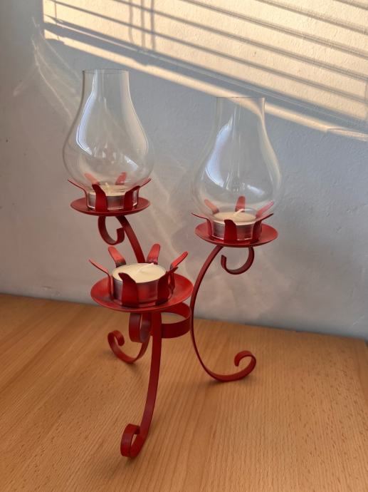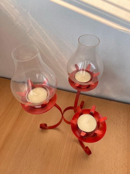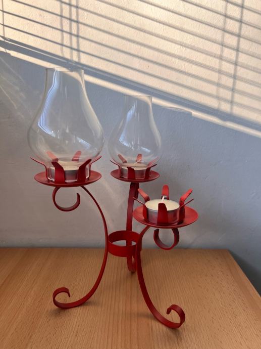 Prodam rdeč svečnik, manjka ena steklena čaša, kot je razvidno iz slik