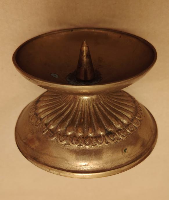 DVA VINTAGE MEDENINASTA SVEČNIKA, NIZKA, NAMENJENA ZA VEČJE SVEČE.